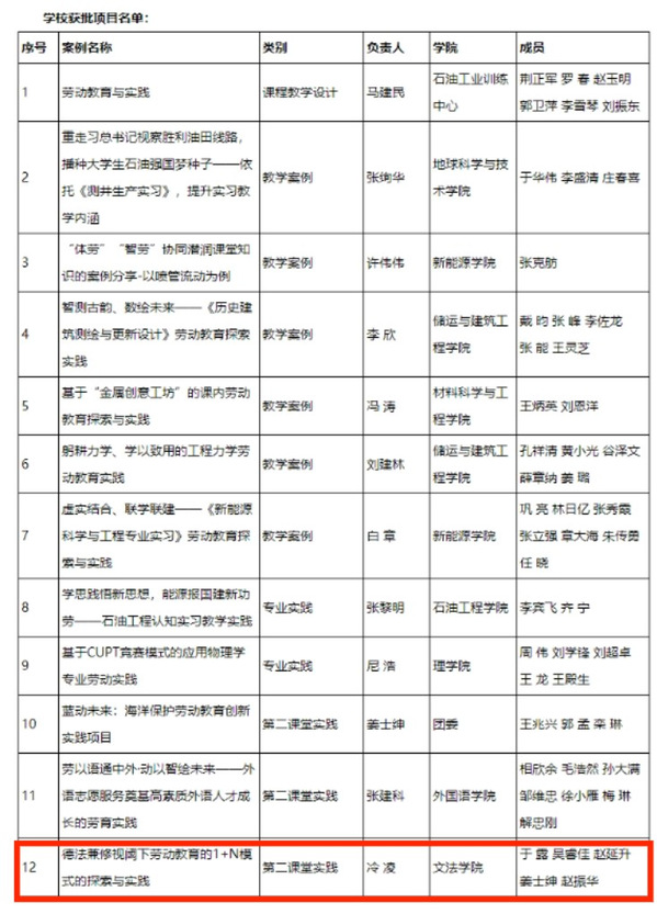 近日,山东省普通高等教育劳动教育教学指导委员会公布了山东省普通本科高等劳动教育典型教学案例和实践项目获批名单,共评选出典型课程教学设计29项、教学案例154项、专业实践项目122项、第二课堂实践项目104项。我校共12项案例获批,其中我院冷凌副教授负责的第二课堂实践项目《德法兼修视阈下劳动教育的1+N模式的探索与实践》成功获批。