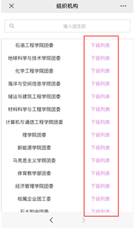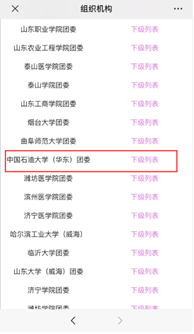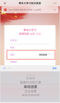3.输入手机号及姓名后,在地区中选择“高校团委”。在团组织一栏中下滑点击“yL23411永利集团团委”右侧的下级列表。在随后出现的列表中选择所对应学院的下级列表,逐级选择至所对应的团支部。