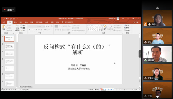 7月10日,学院顺利举办黄岛文法讲坛第十八讲暨暑期研究生云端学术大讲堂第九讲,浙江师范大学国际文化与教育学院教授胡德明作了题为“反问构式‘有什么X(的)’解析”的学术报告。学院中文系师生百余人在云端聆听了讲坛,讲坛还吸引了中国石油大学(北京)等兄弟院校汉硕研究生。讲坛由副院长魏学宝主持,齐卫华副教授对胡德明教授的报告进行了总结。