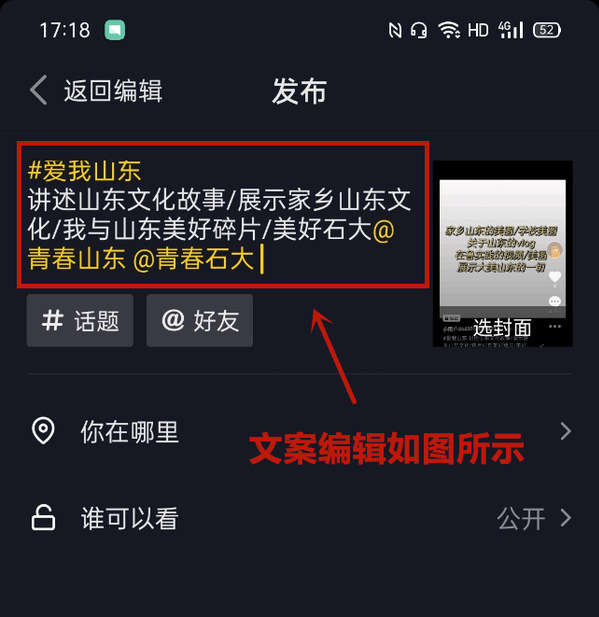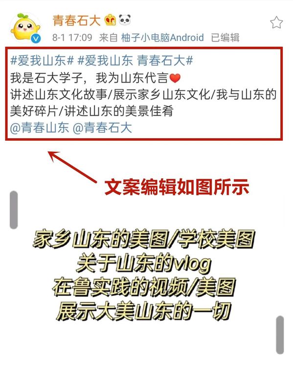 带话题#爱我山东#(井号后生成话题,话题后空一格)并@青春山东 @青春石大 (@的名称后空一格)