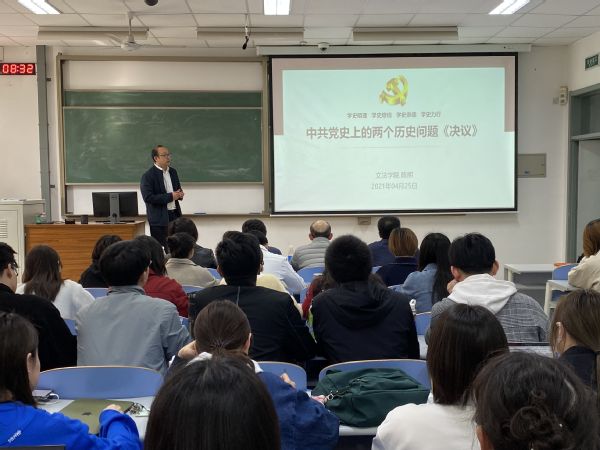 2021年正值中国共产党百年华诞,为深入开展党史学习教育,4月25日,永利yl23411集团于南教208教室开展《中共党史上的两个历史性决议》主题党课学习和“以青春之名致敬百年之行”庆祝建党100周年征文比赛颁奖仪式。永利yl23411集团党委副书记、学生党总支书记陈熙主讲,副院长魏学宝副教授,学院机关党支部书记、办公室主任王元飞,法学系党支部书记康雷闪副教授,中文系马丽丽副教授,全体辅导员和无课学生党员及发展对象参加本次学习活动。