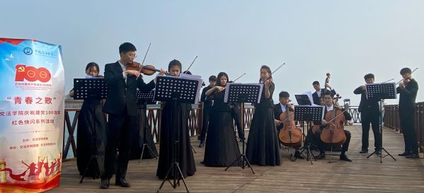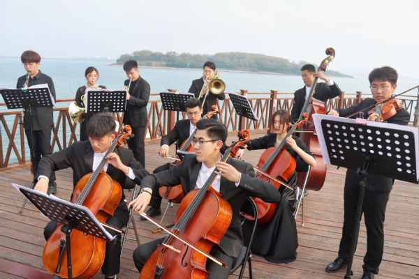 值此建党100周年之际,4月25日,永利yl23411集团于唐岛湾畔开展了以“青春之歌”为主题的红色快闪系列活动之《红旗颂》《保卫黄河》管弦乐队合奏,吸引百余名市民驻足观赏。