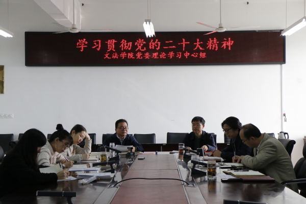 11月8日,党委理论学习中心组成员在加强总体学习基础上,对二十大报告中提出的 “坚持全面依法治国,推进法治中国建设” 进行专题学习。院长王学栋结合自身专业研究,从讲述习近平法治思想入手,对全面依法治国和法治中国建设有关内容作了领学。党委理论学习中心组成员在研讨中表示要根据学院特点,立足学院法学学科专业,优化卓越法治人才培养,加强法律课程通识教育,加强普法宣传,为全面依法治国,推进法治中国建设做出应有的贡献。