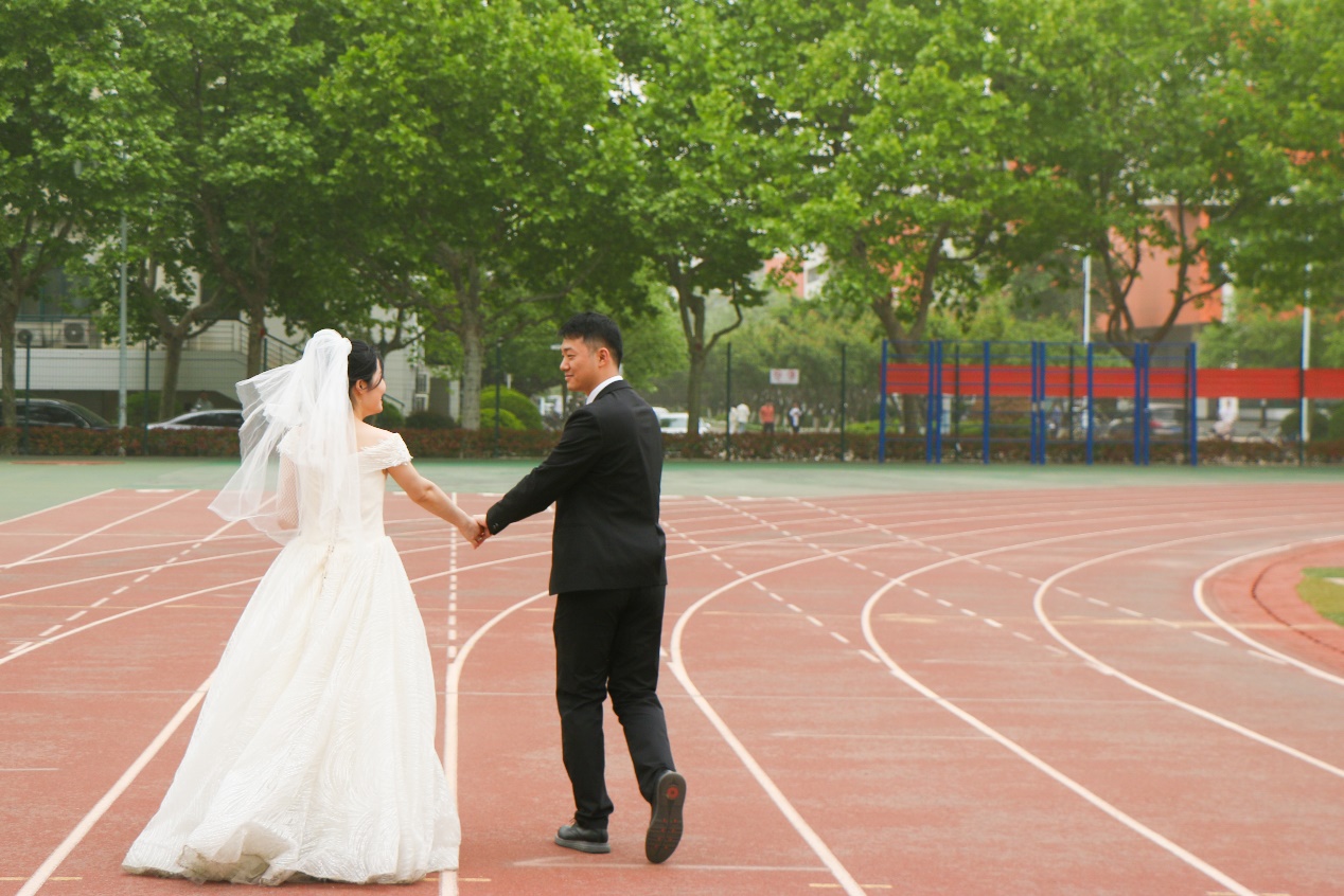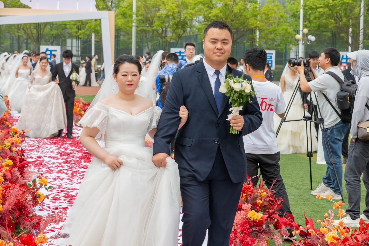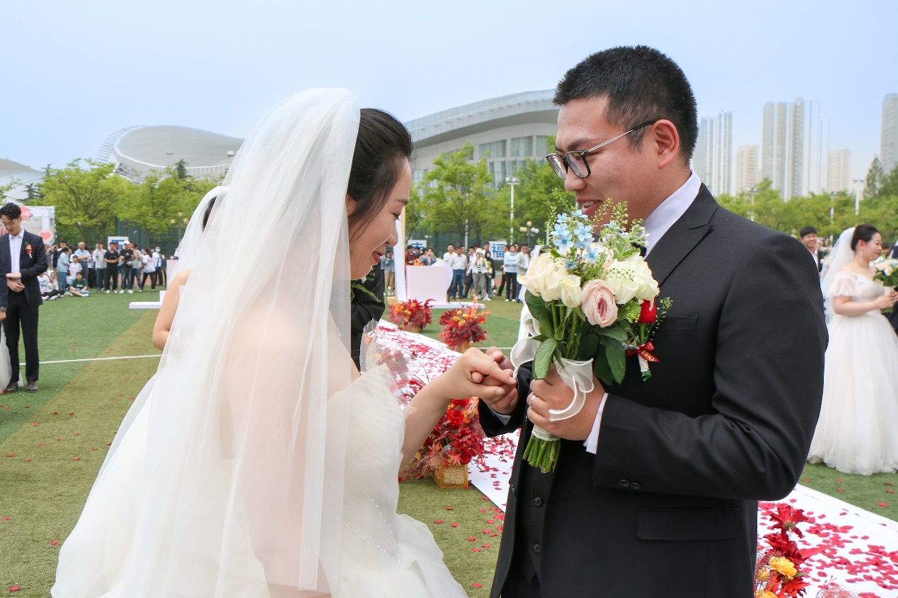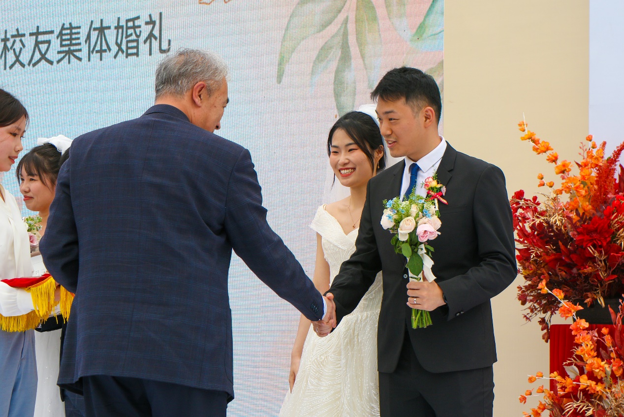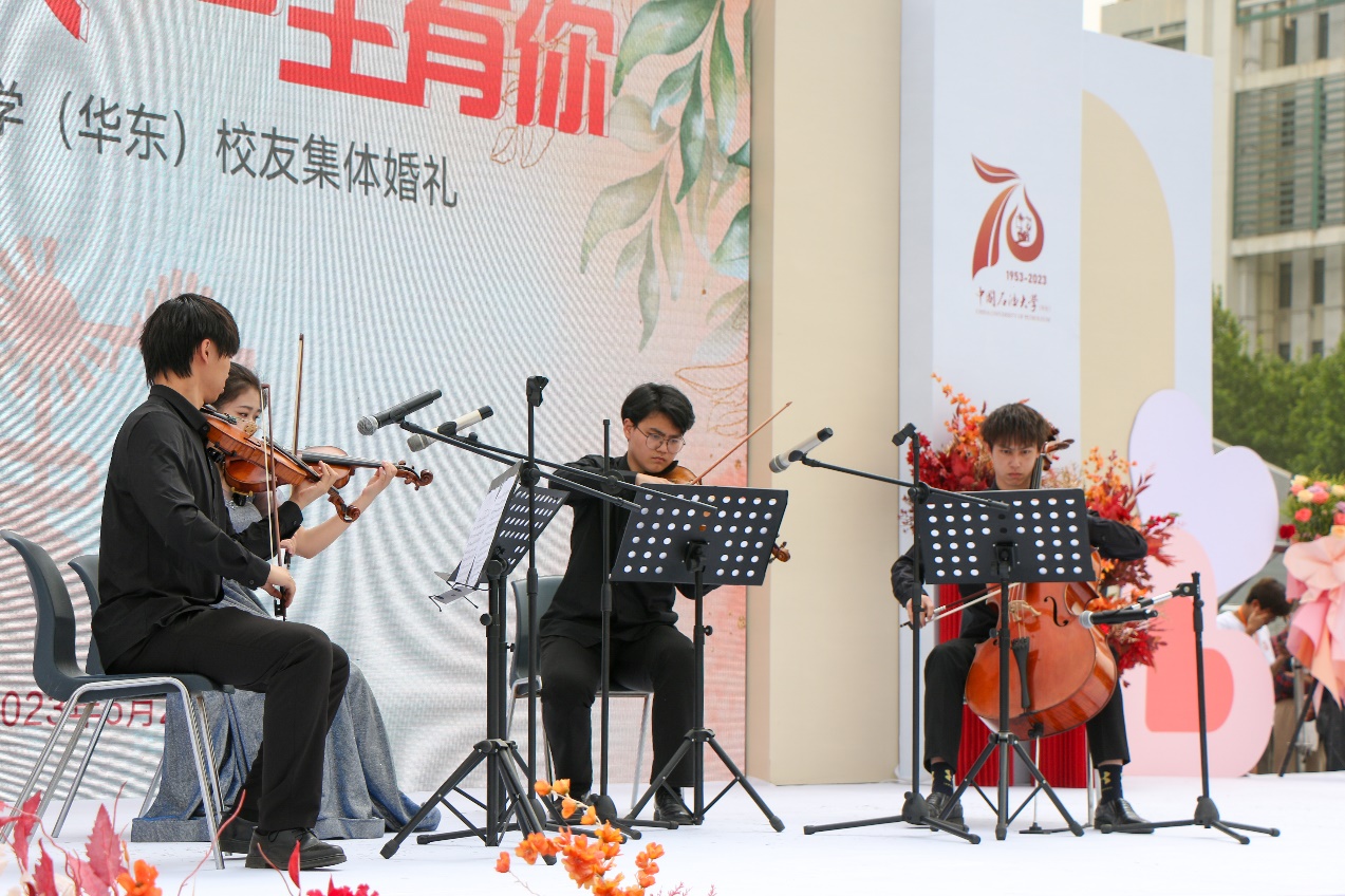 5月21日上午,4对文法校友新人在唐岛湾校区田径场参加了校友集体婚礼。新人们在弦乐重奏中走过红毯,由校领导致主婚辞、中国石油大学校友会会长证婚,新人交换对戒、教师代表为新人送上祝福、颁发纪念婚书,在全校师生的共同祝福中完成了这场特殊的婚礼仪式。据了解,婚礼对戒由汉语言文学专业2007级校友杨泞菱赞助,象征着永恒不变、无怨无悔的爱情。