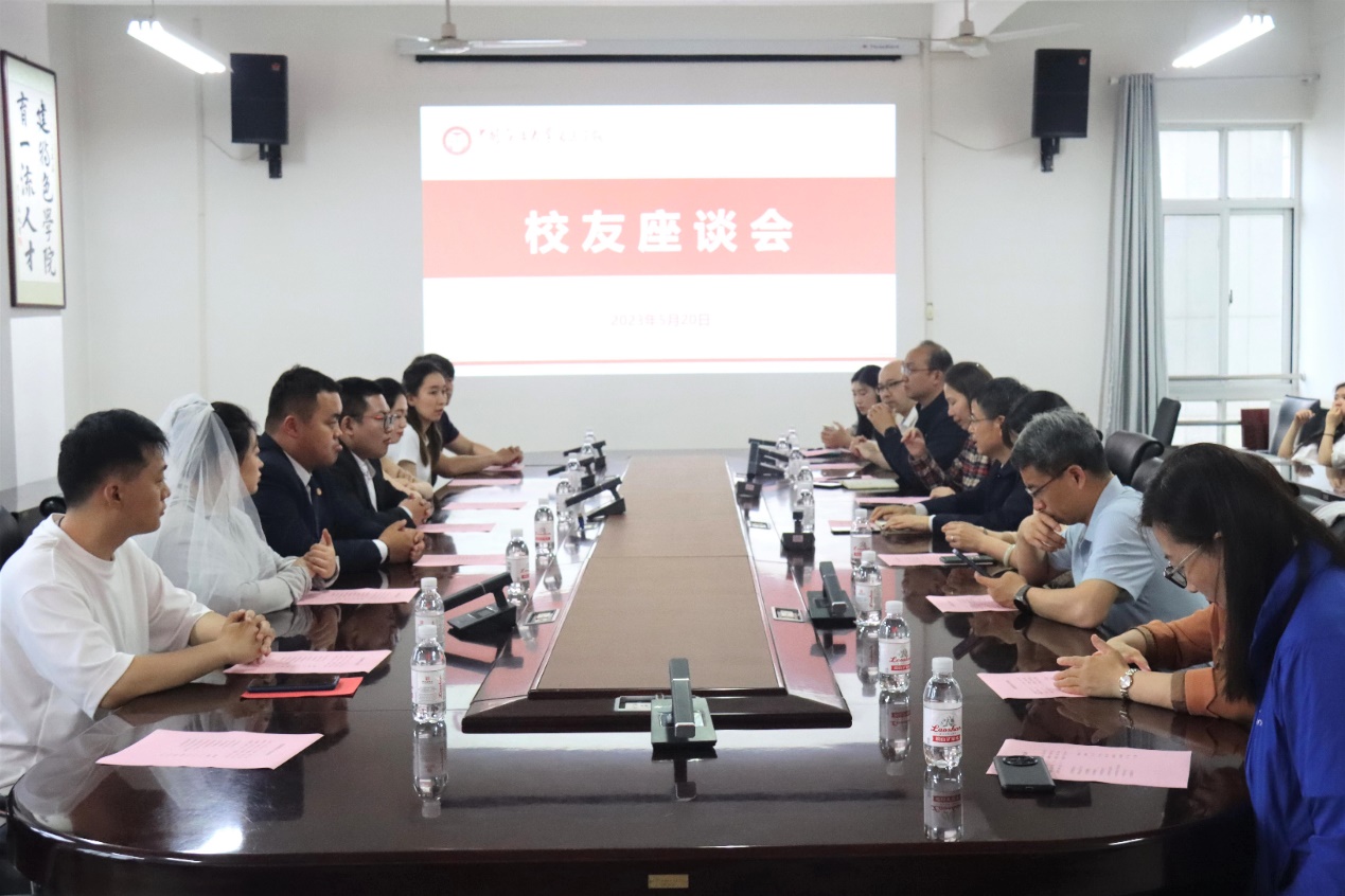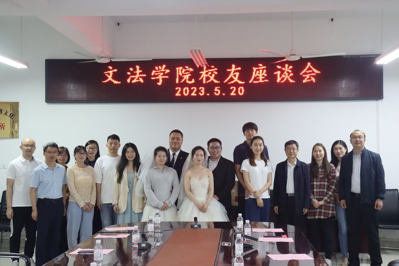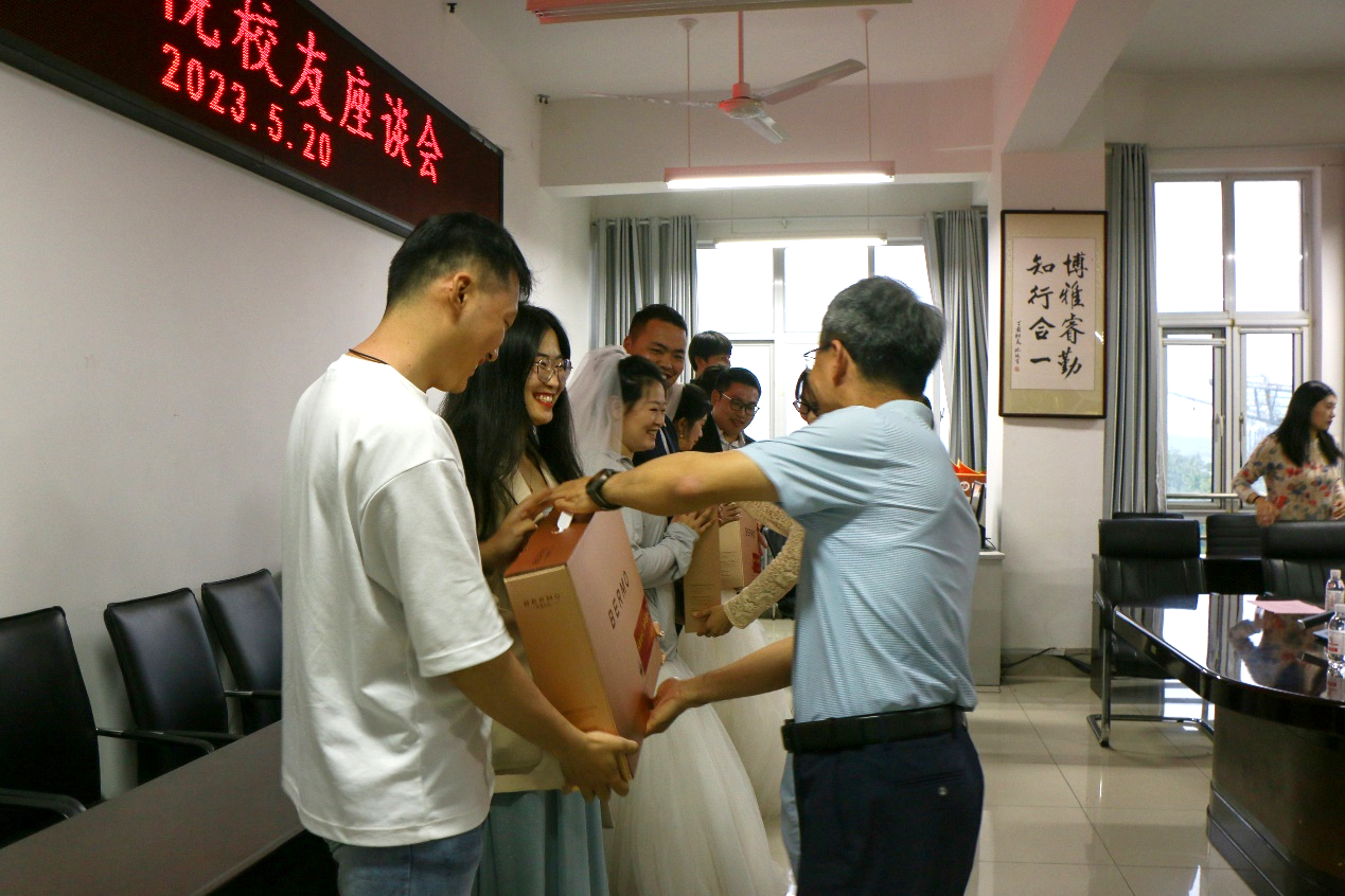 座谈会由党委副书记陈熙主持,党委书记姚成郡,学校法治办公室主任赵振华,副院长刘清、冷凌,法学系支部书记康雷闪,中文系教师马丽丽,音乐系主任苏静以及团委书记于露参会。姚成郡向校友介绍了院系发展的基本情况,指出学院正处于良好发展的上升阶段,他表示,“你们的感情将传为学校和学院的佳话,希望你们今后可以经常成双成对地回到母校,衷心祝福比翼齐飞,同心同德,一生相伴。”随后,教师代表依次送上真挚的祝福,并为新人们赠予精美礼物,铭记他们感情最美好的邂逅。