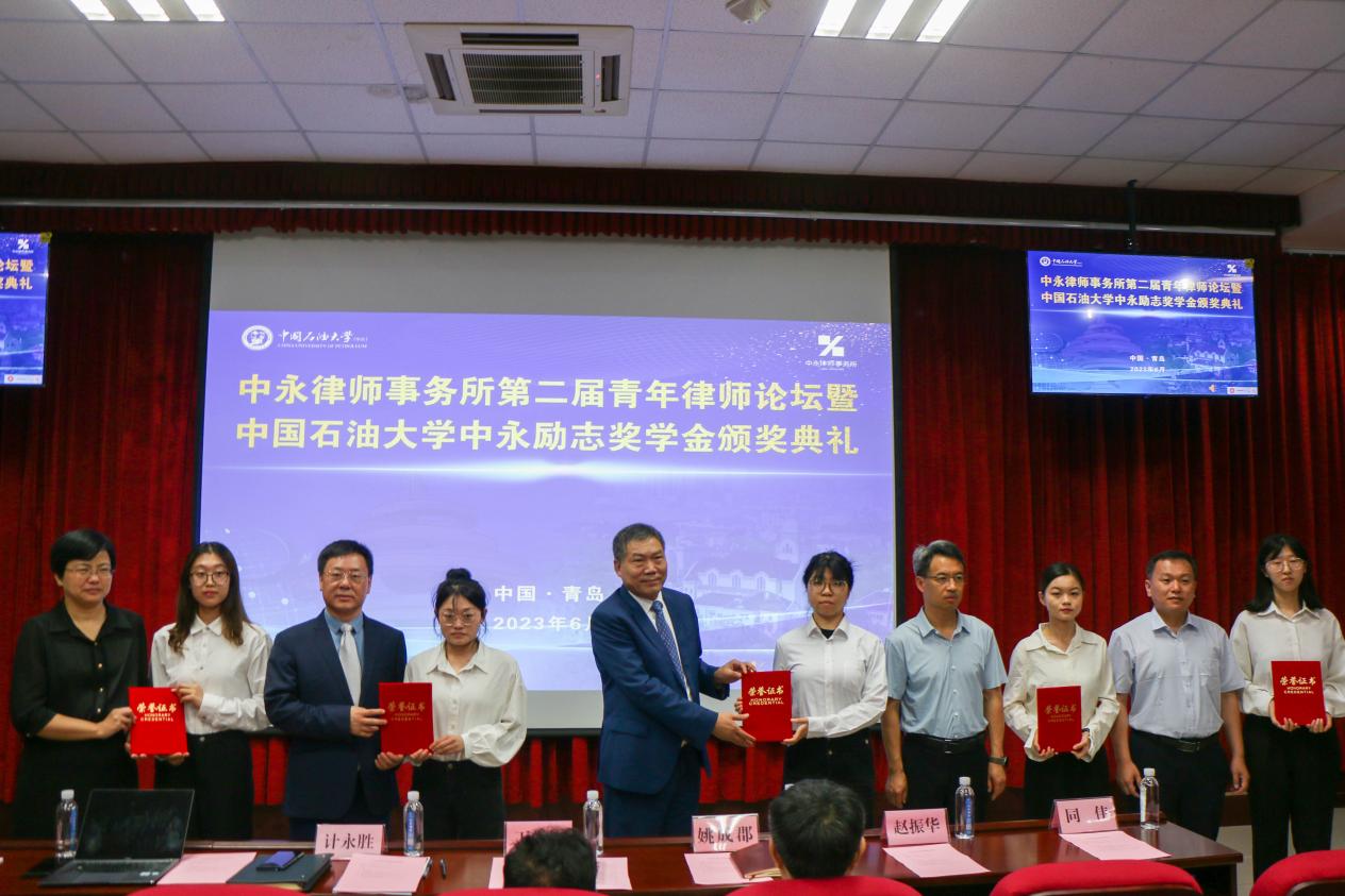 6月18日,中永励志奖学金颁奖典礼在文理楼142举行。北京市中永律师事务所主任计永胜、高级合伙人刘自立,北京中永(青岛)律师事务所主任同伟、支部书记杨志刚,北京中永(合肥)律师事务所主任凌芸等参加典礼。典礼由永利yl23411集团党委副书记陈熙主持,院长王学栋,党委书记姚成郡,学校办公室副主任、法治办主任赵振华等出席。