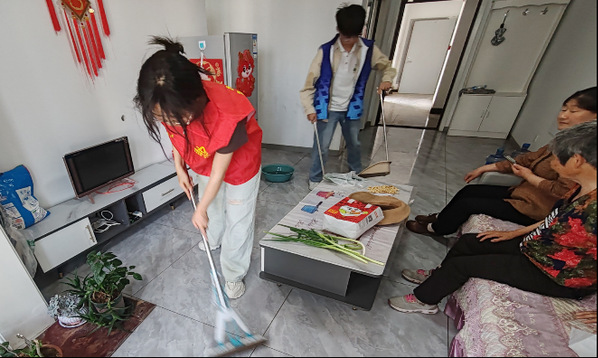 团支部成员在社区负责人的带领下分两队前往两位老人家中,开展志愿服务活动。支部成员热情向老人问好,关心老人的生活情况,为老人收拾内务、照料花草、分组清理桌面、扫地、整理、拖地等,分工合作,井井有条,在支部成员的共同努力下屋内地面一尘不染,桌面干净整洁,处处充满了温情。“家里好久没这么热闹了,你们能来陪我说说话,我真的很开心。”老人说道。欢声笑语打破了平时的冷清,老人脸上和蔼的笑容也赋予了本次活动更美好的意义。劳动的汗水从耳边划过,奉献的精神将会永远镌刻于心底。