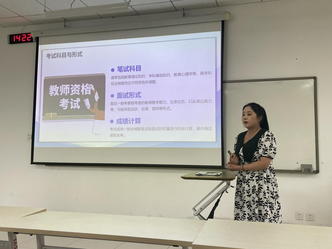 讲座伊始,王老师对国家教师培训政策进行解读,帮助学生认识中小学教师岗位。接着,老师介绍了教师资格证和教师编的定义、重要性、报考条件、备考策略等知识,并针对同学的问题进行细致的答疑。最后,王老师也给出了宝贵的建议——制定考编计划、制定学习计划和前置复习。与此同时,还要避免一些常见误区,例如信息差、走捷径。