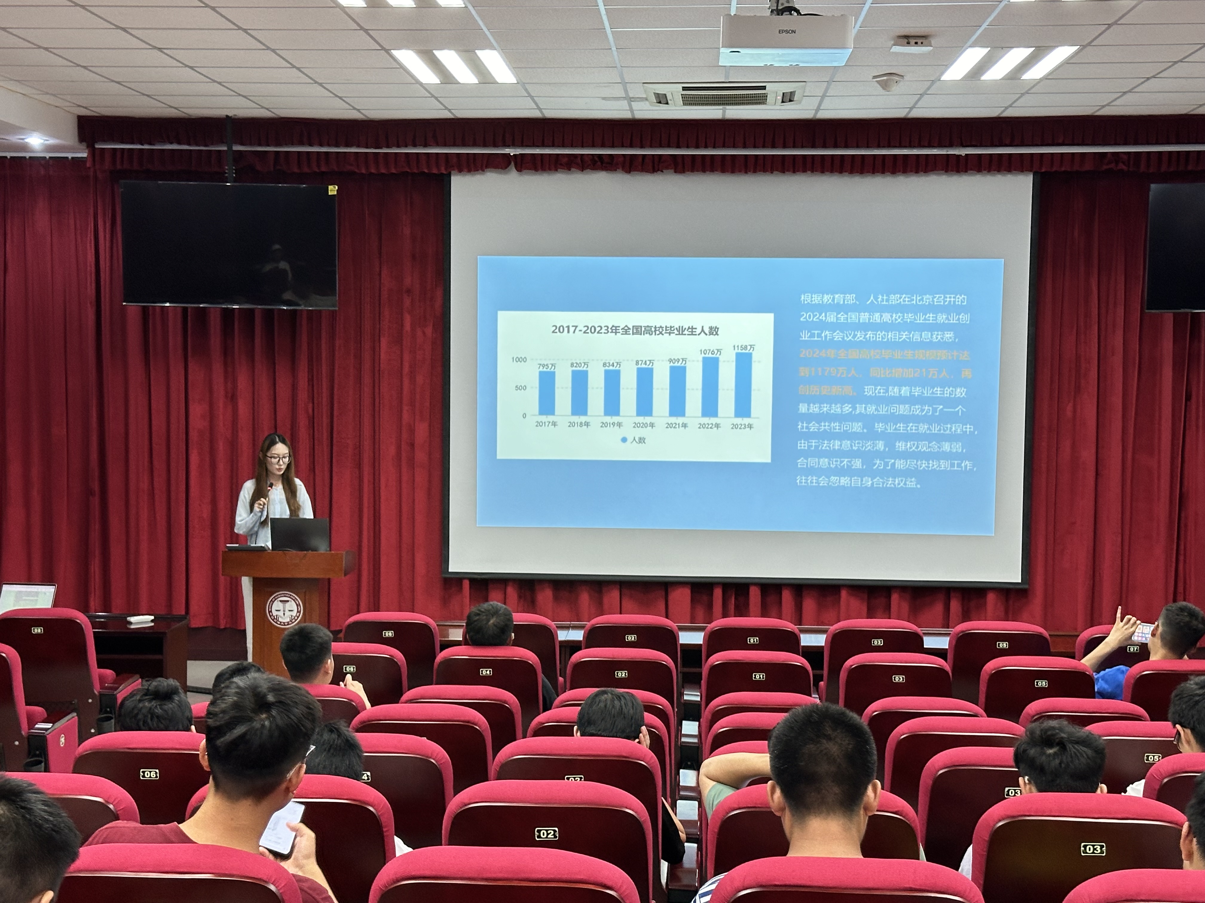 第一部分,宣讲团成员总结了2017年至2023年全国高校毕业生人数变化趋势,使得同学们意识到当前就业形势的严峻,以及在就业过程中可能遇见的侵犯自身法益的情形。宣讲团成员同时与同学们进行了互动,鼓励同学们讲出与劳动法有关的词语,进而概括出三方协议、违约金、试用期等劳动法相关的知识。