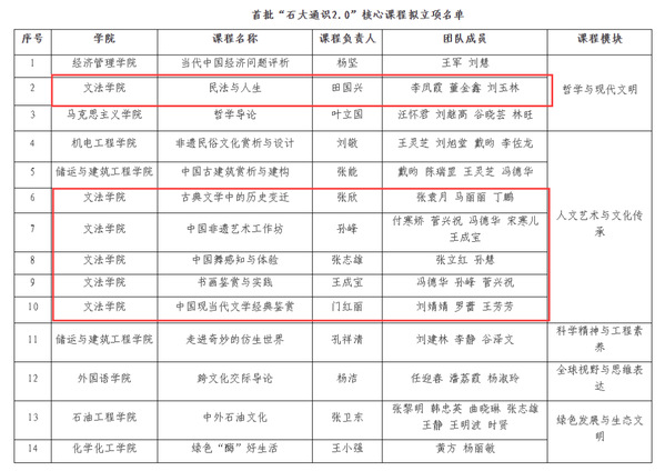 近日,学校教务处公布了首批“石大通识2.0”核心课程立项名单,经个人申报、单位推荐、通讯评审、现场答辩,确定首批“石大通识2.0”核心课程14门,其中我院6门课程成功入选。