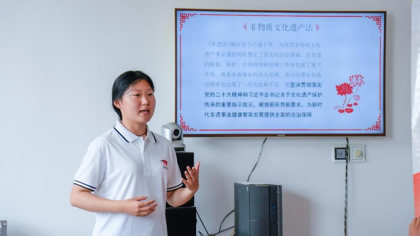 经过走访调研,实践队发现,高密剪纸在取得一系列成绩的同时,也存在一些问题。比如,民众对非遗保护的重要性认识不足,缺乏主动保护和传承非遗的意识和动力。因此,实践队在河南村开展了以“以法治之力为剪纸非遗保驾护航”为主题的“非遗+法治”普法宣传活动,通过案例引入、分析讨论、“你问我答”等方式,用浅显易懂的语言解读了非物质文化遗产法》《知识产权保护法》有关内容,增强村民们对非物质文化遗产保护的意识,引导群众有效保护剪纸非遗技艺。