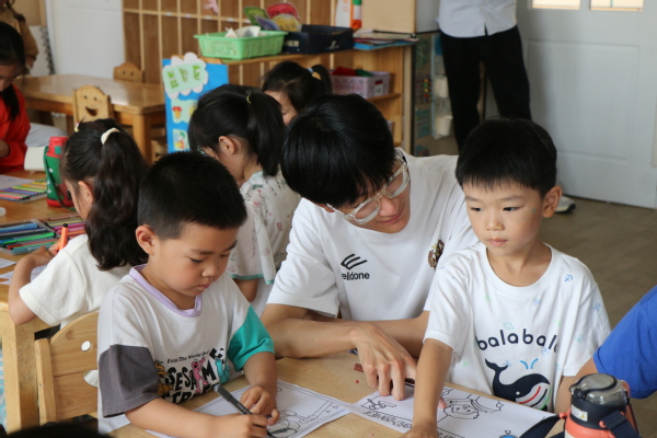 为了让孩子们趣味性地了解宪法知识,增强法律意识,实践队成员王子涵和刘峻宏带领孩子们一起学习歌曲《宪法伴我们成长》。在学习过程中,刘峻宏用钢琴为孩子们伴奏,让孩子们感受这首歌的旋律和节奏。与此同时,孩子们跟着王子涵的细致讲解以及一同合唱,体会和感受歌唱时气息的流动。面对孩子们提出的问题,王子涵和刘峻宏也耐心解答并逐一指导,帮助孩子们改进不正确的音调。在两位实践成员的共同努力下,教室里回荡着孩子们童稚且优美的歌声。