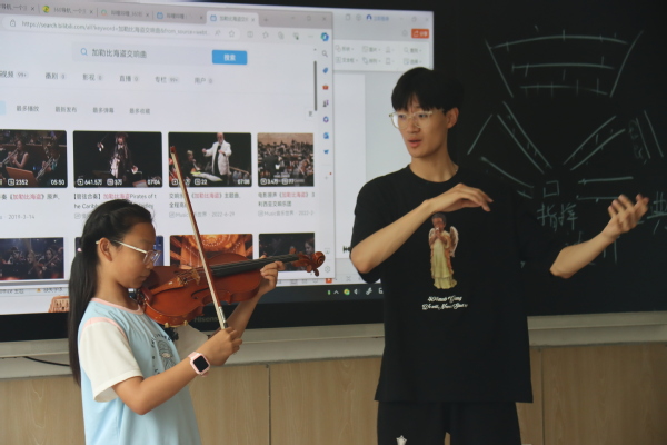 为了让孩子们更加直观地感受音乐的魅力,实践队员刘峻宏身着正装,手持小提琴,为孩子们带来了一场精彩的现场演奏。一曲《孤勇者》悠扬响起,激昂的旋律穿透了时空的界限,触动了孩子们的心灵。随后,刘峻宏又介绍了中国小提琴演奏大师吕思清及其经典作品《梁山伯与祝英台》,并亲自示范演奏,让孩子们在悠扬的琴声中领略到了中国传统文化的韵味与魅力。