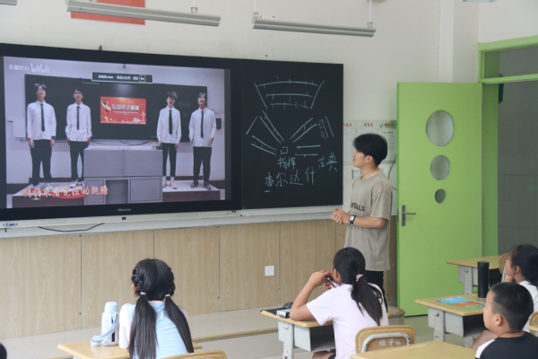 实践队员郝志桓以其生动的讲解和丰富的肢体语言,将复杂的音乐知识化繁为简。“交响乐是音乐艺术中最为复杂,也是最具特殊魅力的艺术形式,无数人为它丰富迷人的音响所吸引,也因它的深远曼妙而怯于接触。”实践队员郝志桓说道,随后他为孩子们讲解了弦乐器与管乐器的构成,“弦乐器是整个管弦乐队音响的骨干,音域宽广、音色优美,演奏方式多样;木管乐器组是音色最为丰富的一组,它们常与弦乐器组合奏,不仅增加了乐队的音量,而且丰富了乐队的色彩;铜管乐器组是管弦乐队中音响最强大的部分,它们不仅能演奏出光辉灿烂、震撼人心的的音响,而且能吹奏出温柔、亲切的曲调。”