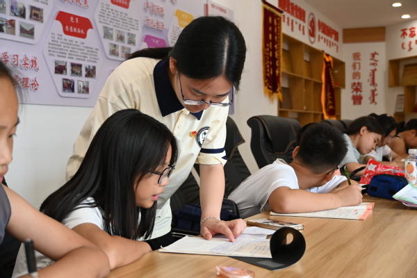 面对着社区居民孩子暑假无人看管、作业无人辅导的难题,15日下午,同心筑梦实践队再次踏入民族社区,大学生们化身小老师,为丰富社区青少年儿童的暑期生活、着力搭建一个儿童喜欢、家长放心、群众满意的辅导平台,让小朋友们度过一个快乐又有意义的暑假,为学生们的暑期安全保驾护航。专业的音乐系队员们用歌声教孩子们唱《北京石油学院学生之歌》,童声盘旋在活动室中,清澈嘹亮。实践队的辅导小课堂辅导范围涵盖小学、初中等多个年龄段的孩子,着力解决每一位孩子的难题、错题,课堂氛围和谐,教学效果显著。甘旗卡镇第三小学三年级的赵阳不慎扭伤了脚,但第二天仍带着作业准时出现在了课堂上。
