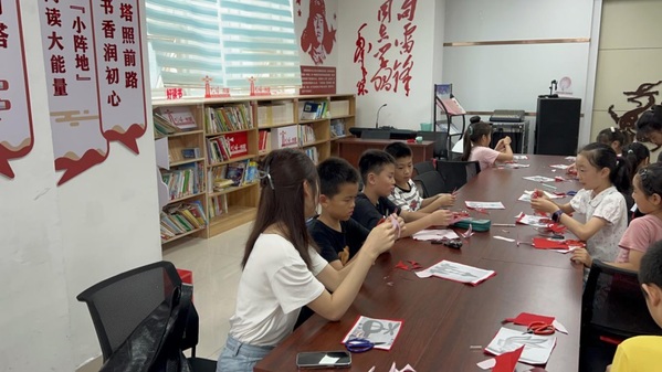 队员刘若桐指导小朋友剪纸 石承鑫摄