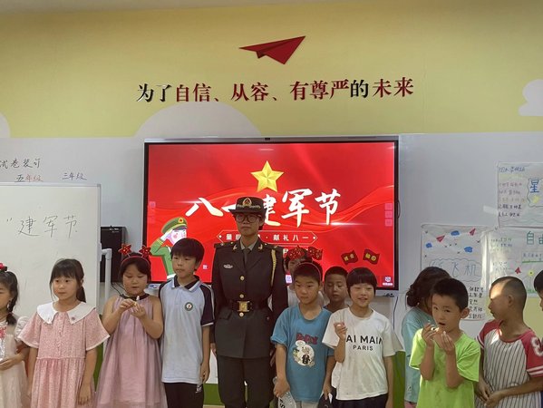 在对建军节有了基本的了解后,班主任针对不同年级,有序开展国防特色主题活动。一二年级的学生和老师一起动手,制作红星发卡;三四年级的同学领到了专为他们设计的红军主题小书包,每个书包上都绣着鲜艳的五星红旗图案,寓意着传承红色基因与爱国情怀。五六年级的学生尝试拼装红色大风车,并在老师的带领下学习军体拳,站军姿,踢正步。在活动的最后,随着雄壮的国歌声响起,全场肃立,目光聚焦于缓缓升起的五星红旗,全体人员高声齐唱国歌,每一个音符都饱含着对祖国的热爱与敬仰。升国旗仪式不仅仅是一次简单的仪式,更是一次深刻的爱国主义教育,让同学们的心灵在国旗下得到了洗礼和升华。队长鼓励大家,要像红军战士一样,不怕困难,勇往直前,将红色精神代代相传。