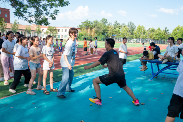 拔河比赛作为传统项目,率先点燃了现场的气氛。同学们分成两队,紧握长绳,脚蹬地面,随着一声哨响,双方队员齐心协力,展开了一场力量与技巧的较量。场边的加油声、欢呼声此起彼伏,将比赛推向了高潮。比赛过程中,支教队成员们鼓励孩子们相互信任、协同作战。紧接着进行的是“一二三木头人”游戏,这个游戏考验了低年级同学们的反应能力和遵守规则的意识。随着支教队成员的口令响起,同学们迅速做出相应动作,或站如松,或静如处子,整个场面既紧张又充满乐趣。在一二三木头人游戏中,支教队成员们以身作则,与孩子们一起参与游戏,通过互动交流,他们教会孩子们如何保持专注和自律。