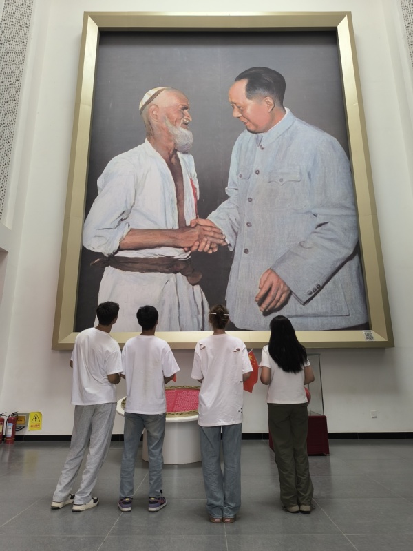 活动伊始,队员们共同参观了和田地区于田县库尔班·吐鲁木纪念馆。一踏入纪念馆,队员们首先被一尊高大的库尔班大叔铜像深深吸引,他骑着毛驴、面带微笑的形象,仿佛正诉说着那段跨越千山万水、心向北京的动人故事。在解说员的带领下,队员们缓缓步入展厅,一幅幅珍贵的历史照片、一件件实物展品,生动再现了库尔班大叔与伟大领袖毛泽东主席之间的深厚情谊,以及他作为中国农民的杰出代表,对党和国家的无限忠诚与热爱。