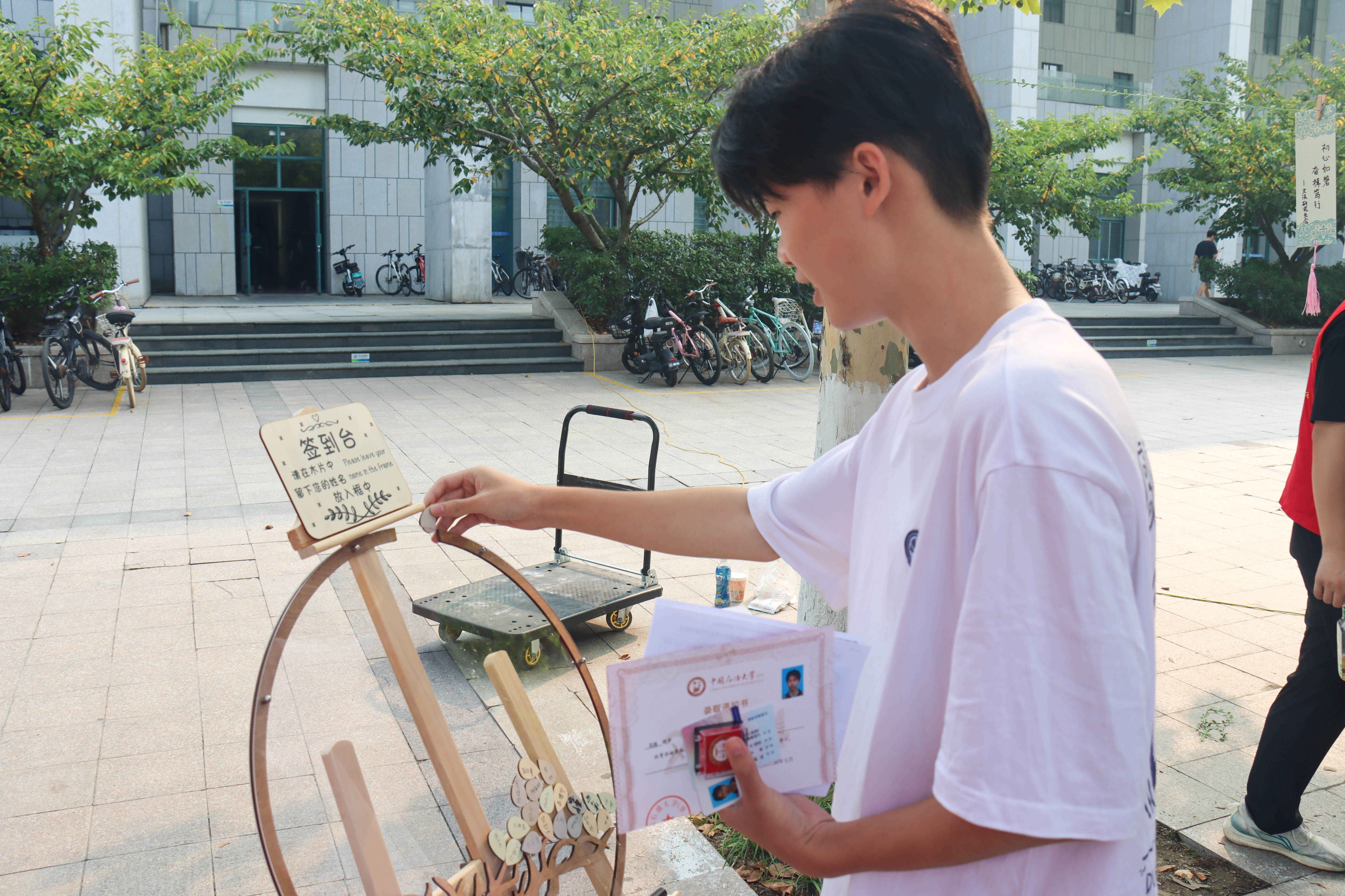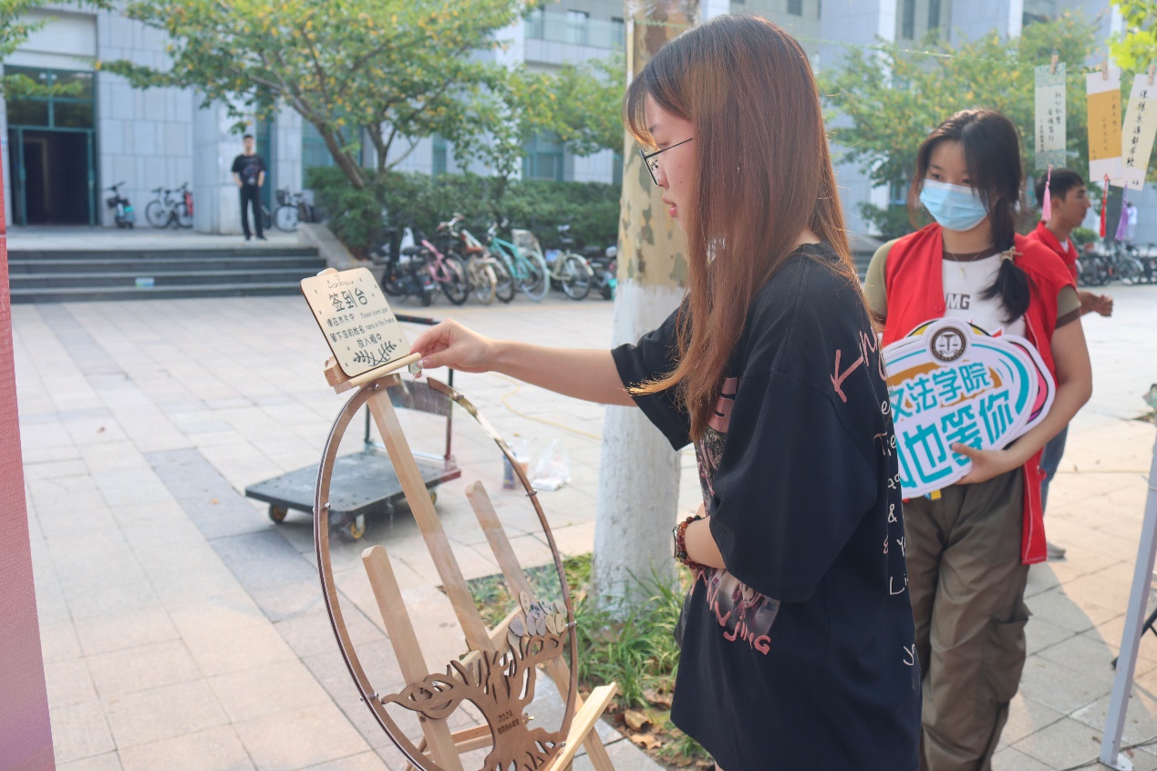不仅如此,学院匠心独运,策划了一场树叶投递仪式,将自然之美与人文情怀巧妙融合。新生们在形似树叶的卡片上写下姓名,并将这片承载着个人印记的“绿叶”投入树木造型的容器中,象征着个人与学院之间根深叶茂的联系,寓意着永利yl23411集团如参天大树般,在知识的滋养下生生不息。