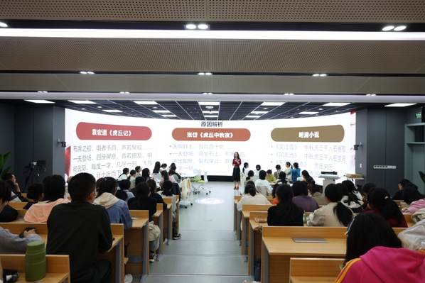 讲座伊始,张袁月副教授提出,文学地理学是一门新兴的跨学科领域,其中文学地图学和文学景观学是当下的研究热点。接着,她介绍了文学地理景观的内涵,以及自然景观、人文景观、文学景观、知名文学景观等不同层级。本次讲座主要以泰山、虎丘、黄鹤楼、西湖几个知名文学景观为例,分析文学与景观的双向影响与互动机制,并帮助在场观众深入了解名胜古迹的历史底蕴与文化基因。