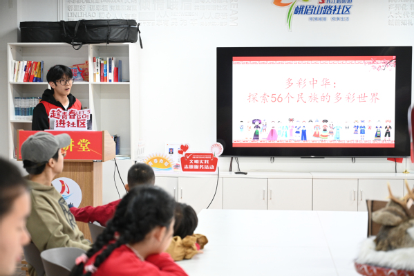 活动在峨眉山路社区党群服务中心三楼拉开帷幕,法学2201团支部的成员与社区各年龄段居民共同参与。活动伊始,法学2201团支部成员鲁恩浩通过精心准备的ppt,直观地为社区居民讲解少数民族传统文化,首先映入眼帘的是各民族传统服饰,ppt中展示了包括蒙古族、回族、苗族、傣族、藏族、壮族、维吾尔族、彝族等民族的特色服饰。每一件服饰都蕴含着深厚的历史文化底蕴,展现了各民族独特的审美和生活方式。随后,少数民族学生艾麦提•托乎提与社区居民互动,讲述维吾尔族的知识并教小朋友们一起跳舞,为他们带来生动的民族文化教育。