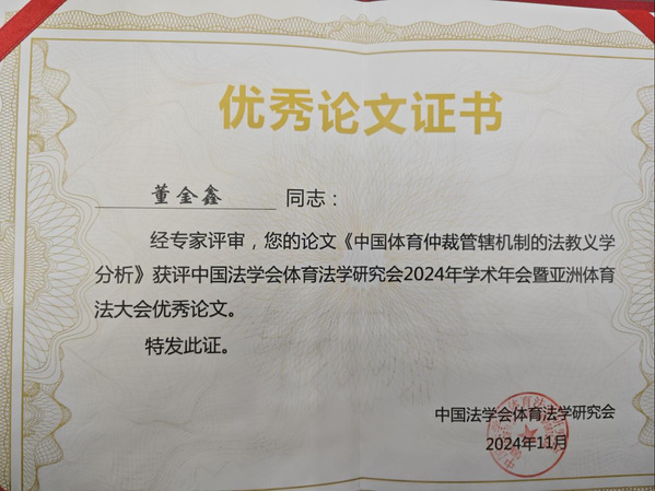 我院董金鑫老师参加了此会议,并应邀作专题发言。董老师以《中国体育仲裁管辖机制的法教义学分析》为题进行汇报,认为通过对新《体育法》体育仲裁规定的法教义学分析,可以发现中国体育仲裁的管辖机制存在相当的特殊性,不仅与商事仲裁不同,而且并未一概照搬国际体育仲裁实践。首先,作为国家法律的授权与竞技体育活动组织化双重作用的结果,中国体育仲裁的管辖依据多建立在当事人拟制的仲裁合意。其次,关于管辖的事类范围,无论对处理决定不服发生的纠纷还是因运动员注册、交流发生的纠纷都属于中国体育仲裁的专属范围,而对竞技体育活动中发生的其他纠纷的理解则应关注单项体育协会内部争端解决的现有实践,不宜过于限缩解释。这不仅引起了与会者的热议,而且获得了广泛好评,为合理限定我国体育仲裁的管辖范围提供了新的思路。另外,其汇报依托的参会论文荣获本年度中国法学会体育法学研究会学术年会暨亚洲体育法大会优秀论文。