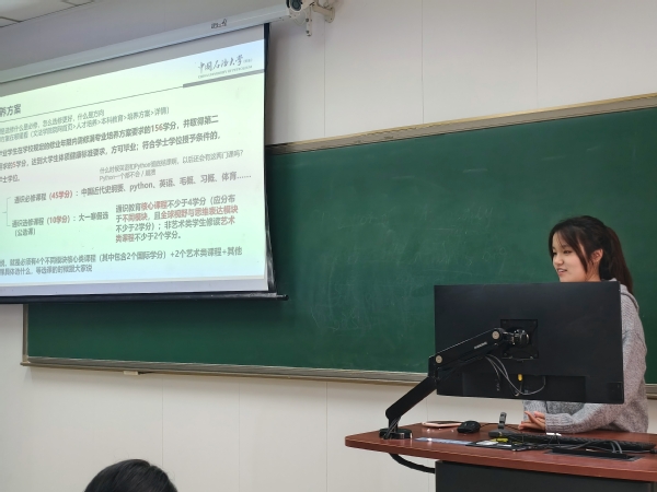 随后,汉语2402朋辈导师罗焜作为优秀学生进行学习经验分享,她提到,“要制定详细的学习计划,将每天的学习任务合理分配到各个时间段,按照计划有条不紊地进行学习。”罗焜针对“2024级本科生培养方案”的选修与必修、学时与学分相关问题进行答疑,用通俗易懂的语言为学生们详细讲解了课程设置体系,包括通识必修课程,通识选修课程等不同板块的安排及相互关系。在讲解学分要求部分时,她着重指出了各类课程学分获取的要点及注意事项,提醒学生们合理规划课程选修,以确保能按时满足毕业学分要求。