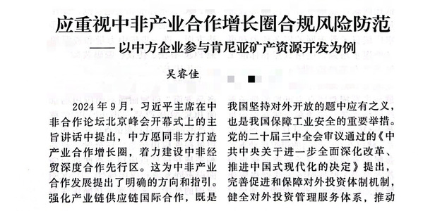 2024年9月5日上午,国家主席习近平同志在北京人民大会堂出席中非合作论坛北京峰会开幕式并发表题为《携手推进现代化,共筑命运共同体》的主旨讲话。讲话中习近平主席提出“中方愿同非方打造产业合作增长圈,着力建设中非经贸深度合作先行区,启动‘非洲中小企业赋能计划’”。吴睿佳博士等人提交的智库报告以在非矿业开发为例,围绕中非产业合作增长圈建设中我国矿业相关企业可能面临的涉外法治风险进行了具体分析和应对策略。
