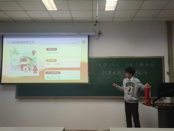 消防安全,关系着校园里每一份安宁,关乎着每一位师生的生命健康,在校园生活的画卷中,消防安全犹如一抹保护色,不容丝毫忽视。为了让同学们更加深入地了解消防安全知识,掌握基本消防技能,11月22日,法学2402班在南教101举行了“防患未然,警钟长鸣”的消防主题班会。