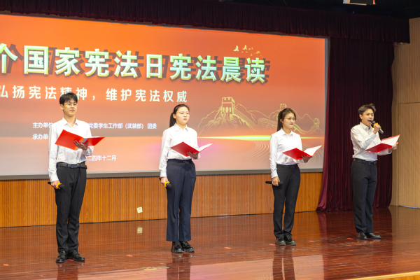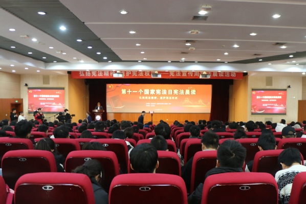活动由法治办公室、党委学生工作部(武装部)、团委主办,永利yl23411集团承办。在庄严肃穆的氛围中,永利yl23411集团院长王学栋教授领读宪法条款,全场师生同步跟读,共同感受宪法的权威与神圣。