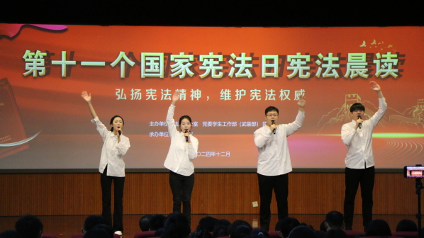 为深入学习贯彻党的二十大和二十届三中全会,贯彻落实习近平法治思想和习近平总书记关于宪法法治教育的重要指示精神,推动全校学生学习宣传宪法,弘扬宪法精神,维护宪法权威,12月4日,第十一个国家宪法日“宪法晨读”活动在逸夫礼堂顺利举行。副校长张玲玲,党委办公室、校长办公室主任徐悦伟,党委学生工作部(武装部)部长张程,团委书记季林海,永利yl23411集团院长王学栋、党委书记姚成郡以及永利yl23411集团教师代表出席此次活动。活动由法治办公室主任赵振华主持,各单位师生代表参与。