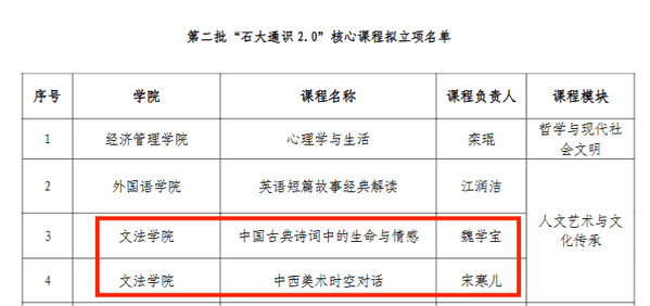 近日,学校教务处公布了第二批“石大通识2.0”核心课程立项名单,经个人申报、单位推荐、通讯评审、现场答辩,确定第二批“石大通识2.0”核心课程16门,其中我院2门课程成功入选。
