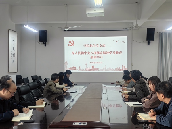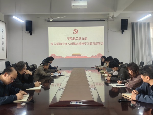 会议强调,机关党支部承担着学院行政管理和服务师生的重要职责,全体党员要深刻认识开展深入贯彻中央八项规定精神学习教育的重大意义,以八项规定为镜鉴,切实增强责任意识和规矩意识。会上,对支部深入贯彻中央八项规定精神学习教育作出具体安排,形式多样、内涵丰富,确保学有质量、查有力度、改有成效。随后,金光日领学《中央八项规定及其实施细则》核心内容,结合工作实际,重点解读精简会议活动、规范出访活动、厉行勤俭节约等条款。