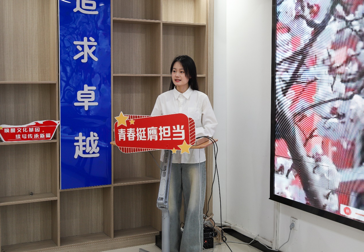 汉语2201班班长王子芃首先聚焦“两会”发展愿景,领学政府工作报告中文化自信相关内容,深入解读文化强国战略与青年责任担当。杨兴潭、郝佳珠作为学生代表结合社会实践、新闻宣传依次分享学习体会,展现“文化+青年”的多样可能。陈怡心、薄纯璐、袁康馨等学生以国家级大创项目为背景、自编自导情景朗诵作品《五岳颂歌·穿越千年的山水诗篇》,更是将班会气氛推向高潮。