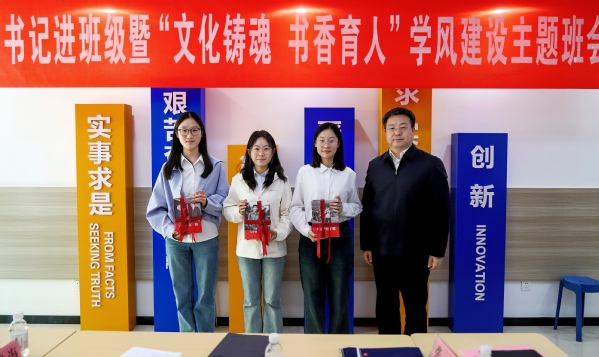 党委副书记马国顺充分肯定了本次班会的积极意义以及班级学风建设的优秀成果,并讲授《文化铸魂 书香育人》微党课。他结合时代背景强调文化在个人成长和国家发展中的关键作用,鼓励学生不断提高思想认识,扎实学习专业知识,以高度的责任感和使命感投身文化强国建设一线。最后,马国顺向班级赠书,激励学生不断进取、再创佳绩。