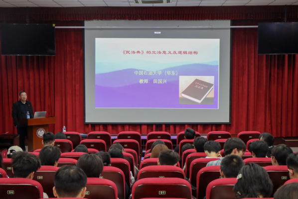 在剖析《民法典》的逻辑结构时,田国兴聚焦法典的体系设计与核心理念,强调民法本质是“权利法”,鼓励学生主动运用法律维护自身权益。他指出我国《民法典》编纂方式具有人格权独立成编、绿色原则、与时俱进的三个特色,并结合农村土地分配等现实案例,生动阐释法律条文与社会实践的互动关系,呼吁学生要节约资源,学会用民法维护自身合法权益,令参与人员受益匪浅。