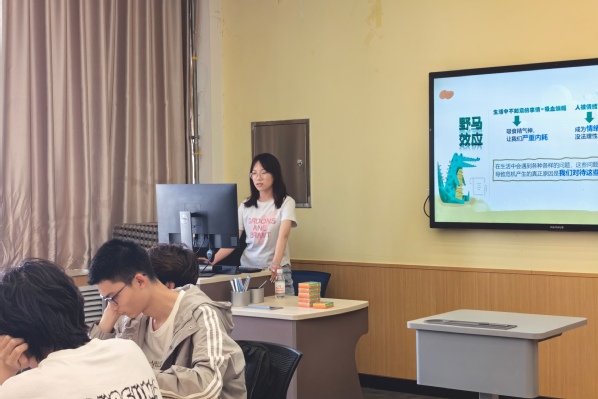 活动伊始,王颖以海龟汤小游戏引入,向大家介绍了心理学中的情绪管理概念——野马效应,借此说明情绪失控对身心健康的破坏性影响,引导大家重视对情绪的认识和管理。随后,她从情绪是什么、情绪的构成、情绪的基本类型以及情绪对人的影响几个方面深入剖析情绪。在讲解过程中,她将理论概念与生动实例结合,指出情绪是内心活动产生的心理体验及对客观事物的态度体验,如生活中收到礼物的喜悦、遭到误解的委屈,还以插画的形式向在场成员展示了喜、怒、哀、惧四大基本情绪类型以及其派生情绪。在讲述情绪体验时,大家纷纷展开交流,现场气氛活跃。