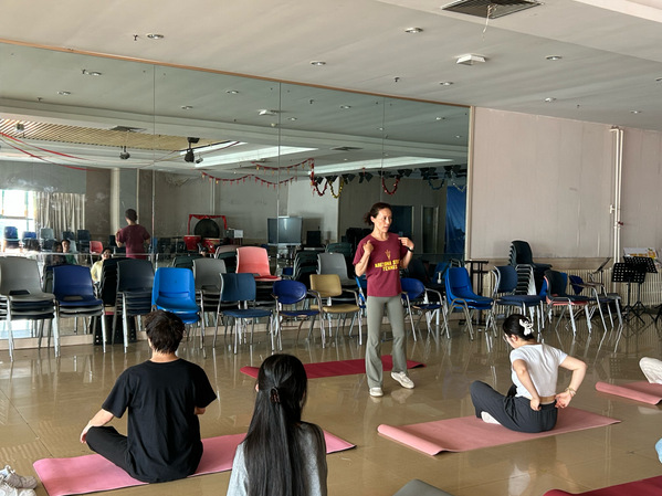 活动过程中,体育教学部的牛静副教授首先介绍了长期练习瑜伽的益处。随后,同学们跟随牛老师的指导,踏上了瑜伽之旅,学习了猫式、桥式等瑜伽练习动作。同学们伴随着呼吸,弓背、塌腰,感受脊柱的延展与收缩,仿佛将积累已久的疲惫都随着动作慢慢释放。在动与静、屈与伸、张与弛的结合中,充分放松身体、感知身体、调动身体,在一点一滴控制协调与发掘潜能的过程中,体会瑜伽身心合一的魅力,享受瑜伽健身带来的身心愉悦和宁静。