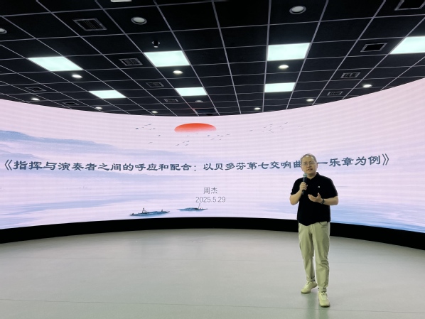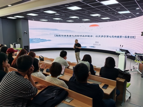周杰以贝多芬的经典作品《贝多芬第七交响曲》作为切入点,深入剖析了在演奏作品时,指挥与演奏者之间如何实现精准的呼应与完美的配合。他通过理论讲解、案例分析以及现场示范,向听众详细阐述了指挥在音乐演奏中所扮演的核心角色。指挥不仅需要对作品有着深刻的理解与解读,更要通过指挥艺术引导整个乐团淋漓尽致地展现作品的情感与内涵。在讲解过程中,周杰副教授还结合自身的指挥经历,分享了许多在排练与演出过程中发生的有趣故事与宝贵经验,让抽象的音乐理论变得生动形象、易于理解。在交流互动环节,周杰就指挥的艺术与同学们进行了深入的交流。