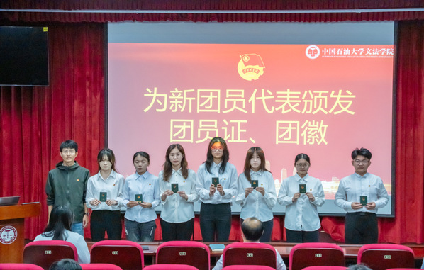 新团员代表法学2401学生邹亚航发言,表达了加入共青团的自豪与为团组织增光添彩的决心。随后由老团员代表法学2301学生鲁力萌分享经验,“奋斗不分大小,要心怀热忱,每一次俯身实干,都是对团员二字的生动诠释。”鲁力萌讲道。他鼓励新团员们保持干劲与进取心,在奋斗中寻找人生意义,在实干中绘就青春底色。