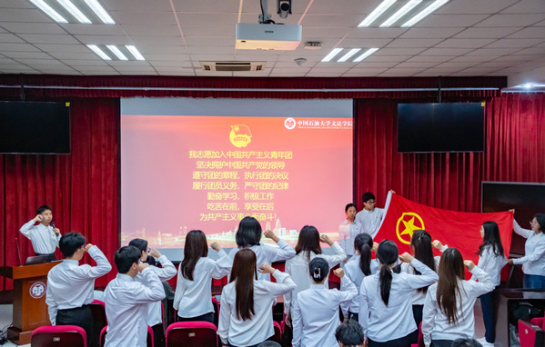 为深入学习贯彻党的二十大精神,进一步提高永利yl23411集团团员队伍建设,提升广大青年的理论素养,5月30日上午,永利yl23411集团2025年春季学期入团仪式暨入团第一课在文理楼142隆重举行。此次活动由永利yl23411集团党委副书记陈熙、团委书记赵延升、马克思主义学院副教授郎帅以及永利yl23411集团辅导员张琳苑、团员代表及新发展团员共同参加。