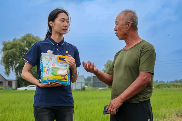 连片的稻田像铺了层绿毯,山水云烟,鸟翔鱼跃,构成了最为生动的直播间。“大家看这稻苗,根系扎得特别稳,叶片绿油油的,等到成熟时颗粒肯定特别饱满。”关淑云蹲在田埂边,轻轻拨开稻叶展示生长状态,指尖还沾着刚触碰过的泥土。包雅楠笑着朝田边招手:“包大叔,快来给大家说说这些鸭子咋帮着种水稻呀?”包千喜手里拿着喂鸭的竹筐走过来,指着在稻苗间游走的鸭子说:“这些小家伙可有用了,在田里跑着吃虫子、啃杂草,不用额外打药除草,它们壮了,稻子也能长得更好。”镜头里,鸭子不时扑棱着翅膀在水洼里嬉戏,稻叶被风吹得沙沙响,主播和农户的对话自然又亲切,网友在评论区留言:“这生态种养模式真好”“等水稻熟了一定要尝尝”“鸭蛋看着就新鲜”。