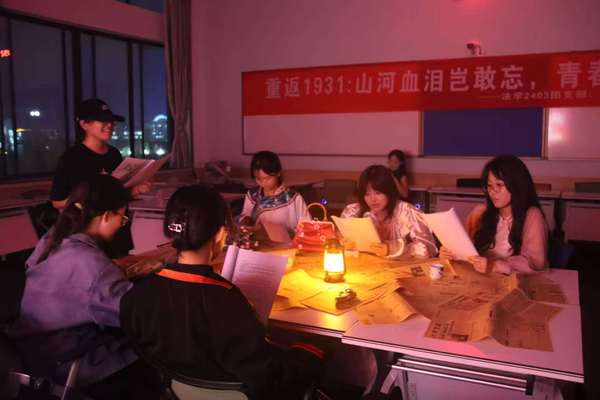 活动前期,法学2403团支部精心筹备,搜集抗战时期历史资料打磨剧本,购置特色服装、旧报纸、复古书信等道具,搭建起兼具历史感与代入感的场景。现场布置细致入微,营造出浓厚的抗战氛围,使参与者一步入会场即仿佛穿越回那个风雨如晦的年代。