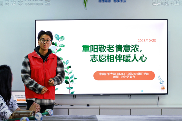 情暖双节至,法润夕阳红。为弘扬中华民族敬老传统,发挥基层团支部服务社会的积极作用,10月23日下午,法学2503团支部与漂有所依志愿服务队部分成员前往峨眉山路社区开展“重阳敬老情意浓,志愿相伴暖人心”重阳敬老主题团日活动。本次活动围绕精神陪伴、健康促进与法律普及三个方面展开,以青春行动传递温暖,以专业智慧护航晚年。