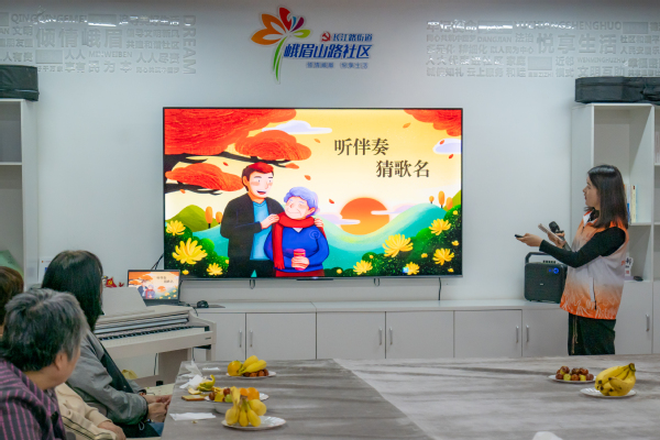 下午两点,志愿者们正紧锣密鼓地布置活动室,现场已洋溢着温馨而热烈的气氛。他们带来了形式多样的文艺表演:节奏明快、语言生动的快板演绎赢得了阵阵喝彩,韵味悠长的古筝演奏《定风波》气势十足,令人沉浸其中。随后主持人带老人们玩起了“听伴奏猜歌名”互动小游戏,经典的旋律响起,老人们的嘴角也渐渐弯起,听着如《最炫民族风》《苹果香》《粉红的回忆》等熟悉的歌曲,老人们逐渐打开自己的心扉,享受着独一无二的集体生日。这些歌曲不仅唤起了老人们的美好记忆,更激发了全场的参与热情,老人们踊跃参与,积极互动,现场欢声笑语不断,志愿者们用歌声传递祝福,用热情温暖心灵。互动游戏结束后,全体人员共同合唱《传奇》《我爱你中国》等脍炙人口的歌曲,抒情的旋律令人潸然泪下。