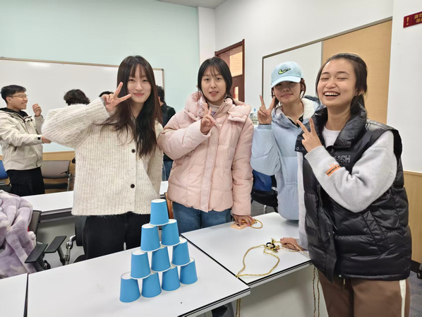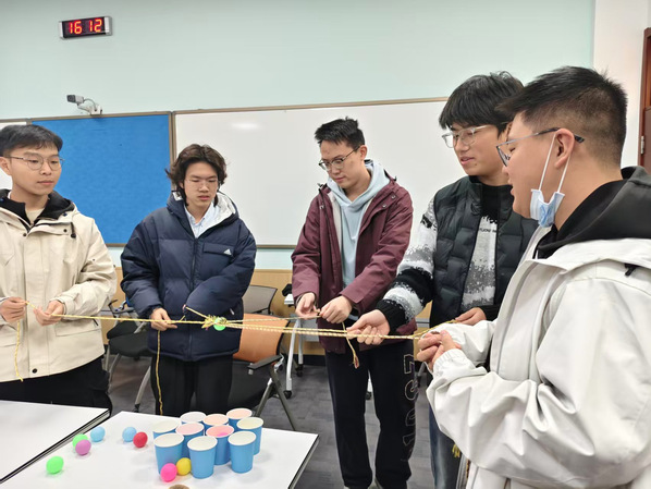 随后消防模拟游戏体验正式开展。首先由负责人讲解游戏规则与安全须知,每组成员共同拉住弹力绳两端,搭建纸杯塔。过程中鼓励成员分工协作,体会团队配合的重要性,呼应消防救援中的协同逻辑。之后开展毛线运水游戏,模拟火灾现场输水作业。每组成员协作拼接毛线轨道,将乒乓球从起点平稳运送至终点托盘。游戏中引导成员沟通配合、调整策略,感受步调一致才能高效完成任务的团队理念,关联中国消防“统一指挥、协同作战”的优势。互动游戏贴近消防工作实际的场景,每一个情节都设计得真实可感,推动成员们角色互动中深度代入消防员职业身份,直观感受消防工作的责任与挑战。