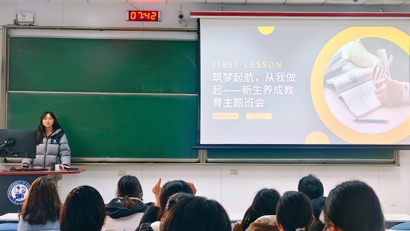 2025年11月24日,汉语2502班在东环303召开了“筑梦起航,从我做起”新生养成教育主题班会。班会由班长孙千惠主持,汉语2502班全体成员参与,孙千惠依次从从大学认知、新生过渡、习惯养成、反诈防贷、职业规划五个方面为班级学生讲解大学生活。