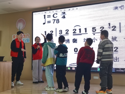 活动开场,大屏上《不要慌太阳下山有月光》的温暖画面亮起,少年合唱团的孩子们便挺直了腰背。实践队员手持话筒,带着大家练习跟唱《月亮翻过小山坡》的乐谱——从“月亮悄悄翻过小山坡”的轻柔起调,到“路边开出小花一朵”的欢快转音,队员们用“拍手找节奏”的趣味方式,带着原本羞涩的孩子渐渐放开声音。当清脆的童声裹着旋律在图书馆里散开,有孩子偷偷跟着摆动脚尖,眼角漾着藏不住的笑意,合唱的快乐让整个空间都暖了起来。