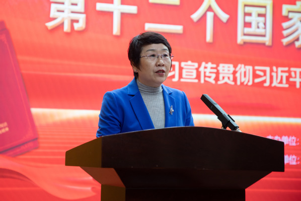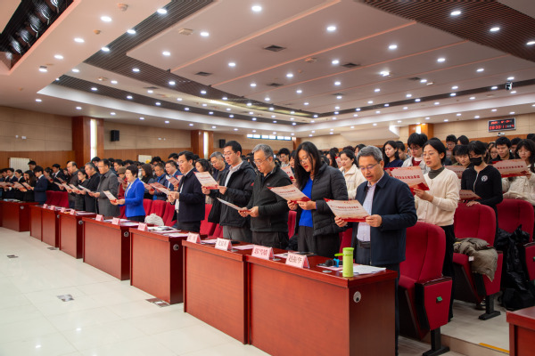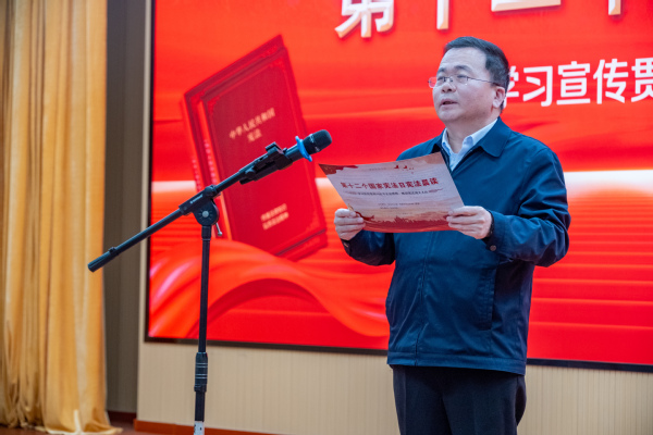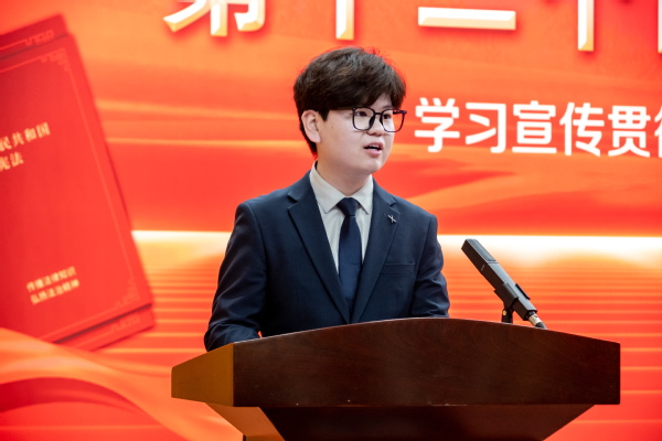 副校长张玲玲在讲话中结合《中华人民共和国法治宣传教育法》的实施,回顾了我国宪法发展历程,阐述了宪法的根本法地位以及宪法对于法治建设的重要意义,指出学校始终以法治为治校之本,通过开设法治课程、开展“法治文化季”系列活动、组建涉外法治实验班等举措,扎实推进宪法法治教育落地。她寄语广大青年师生,“建设更高水平的法治中国,需要一代又一代青年的接续奋斗。希望你们明法于心,守法于行,将个人理想融入国家法治进步的浪潮,以青春奋斗践行法治誓言,用实际行动捍卫宪法尊严,为建设更高水平的社会主义法治国家贡献智慧与力量”。